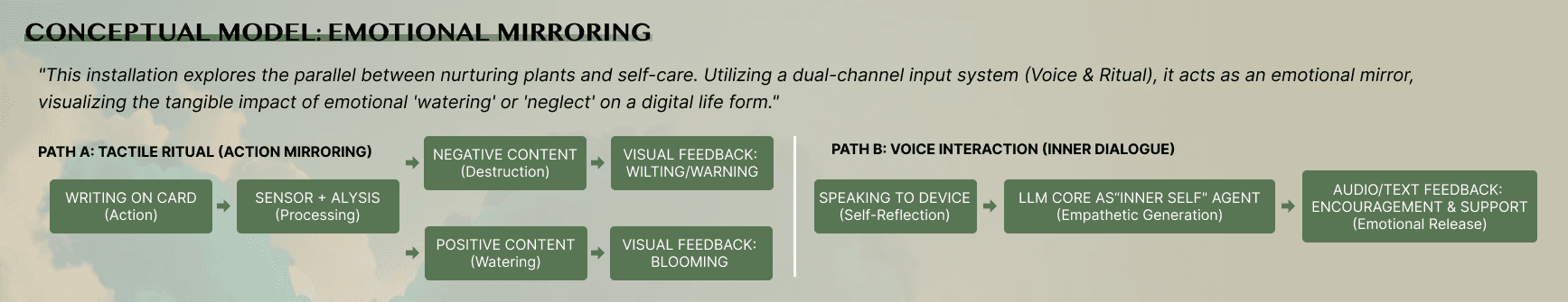 Heartwarming Cactus is an interactive, bio-digital emotional support installation inspired by the symbolism of plants and CBT-informed self-reflection. Instead of treating emotions as something to “fix,” it offers a gentle space where users can externalize stress, notice patterns, and practice small acts of regulation.