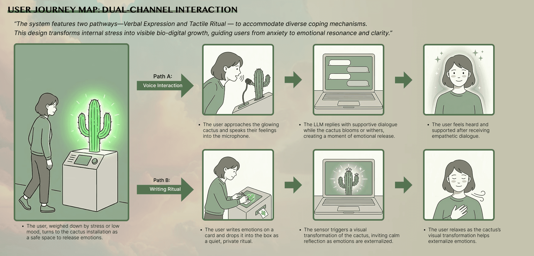 At the center is a digital cactus that visually responds to a person’s inner state. As negative feelings accumulate, the cactus gradually weakens; when users process and release emotional “weight,” the cactus recovers. This slow, readable change transforms invisible emotional strain into an observable living metaphor—making care feel possible in daily life.