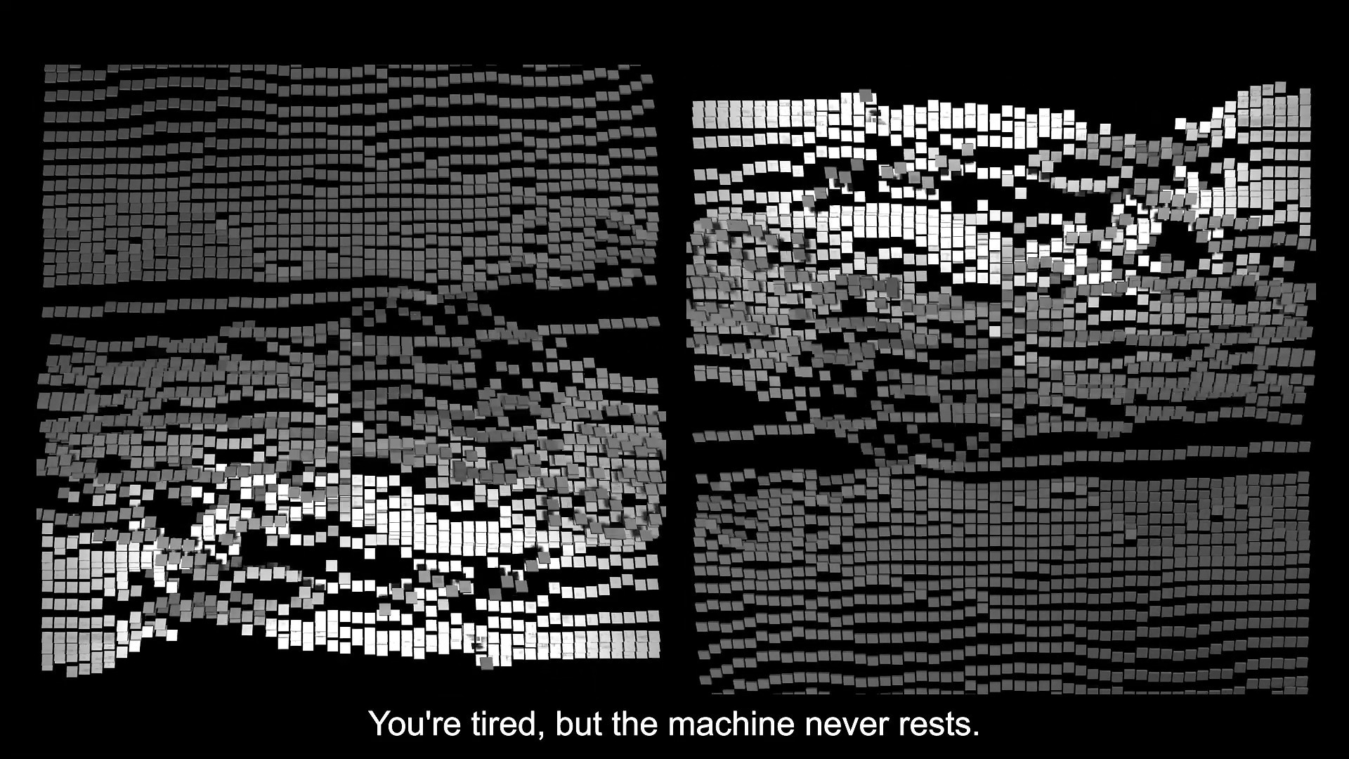 The audience stands between two screens, becoming both viewer and variable. The installation refuses a single stable “self-image.” Instead, it constructs a structure of fractures—deviations, blurriness, repetition, and disruption—so the act of watching becomes a confrontation with being watched.